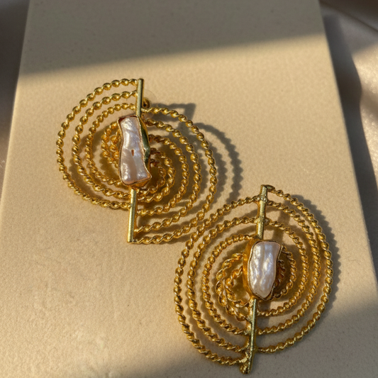 Golden Spiral Pearl Brass Statement Earrings