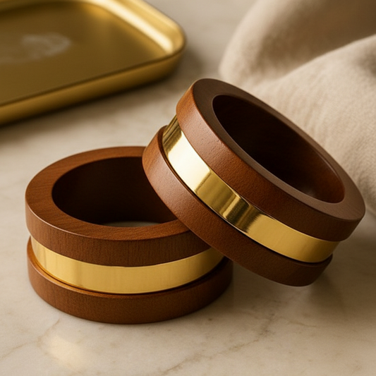 A beautifully curated stack blending brass and wooden elements. The Maya set brings together rustic warmth and contemporary chic in one perfect combination.