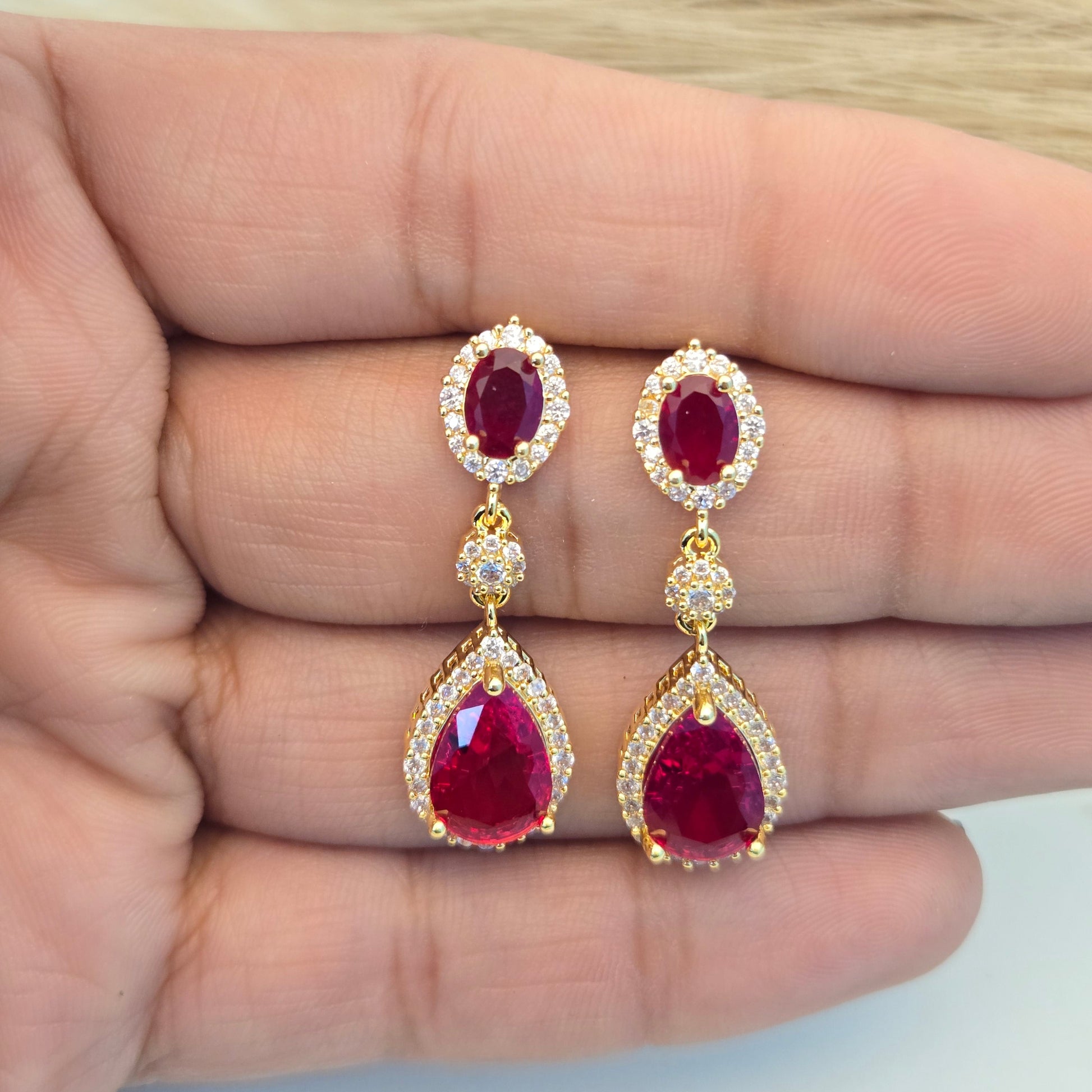 Ruby Crimson Pear Halo Drop Earrings