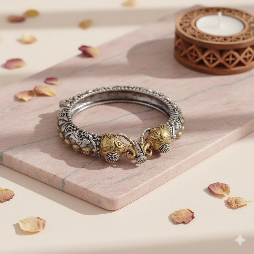 This Gajraj Dual-Tone Kada features intricate elephant heads and floral engravings crafted in oxidised silver with hints of antique gold. Elegant, sturdy, and full of character — it’s the perfect accessory to elevate your festive and everyday ethnic style.
