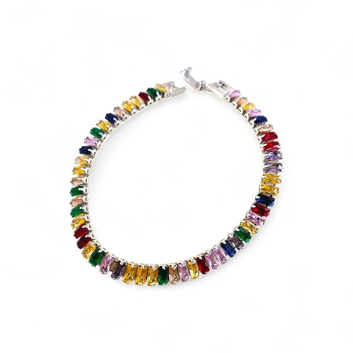 The rectangular-shaped, clear, sparkling multi-colored CZ stones, including Sapphire, Pink, Ruby, Emerald, and Blue. The CZ stones are naturally arranged, with each bracelet featuring a unique color sequence, offering a refined and elegant appearance