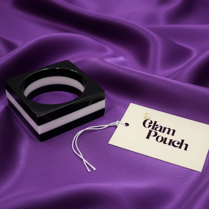 A chic geometric bangle featuring clean black-and-white stripes in a modern square shape. The smooth resin finish adds a contemporary touch, making it ideal for monochrome styling and elevated casual wear.