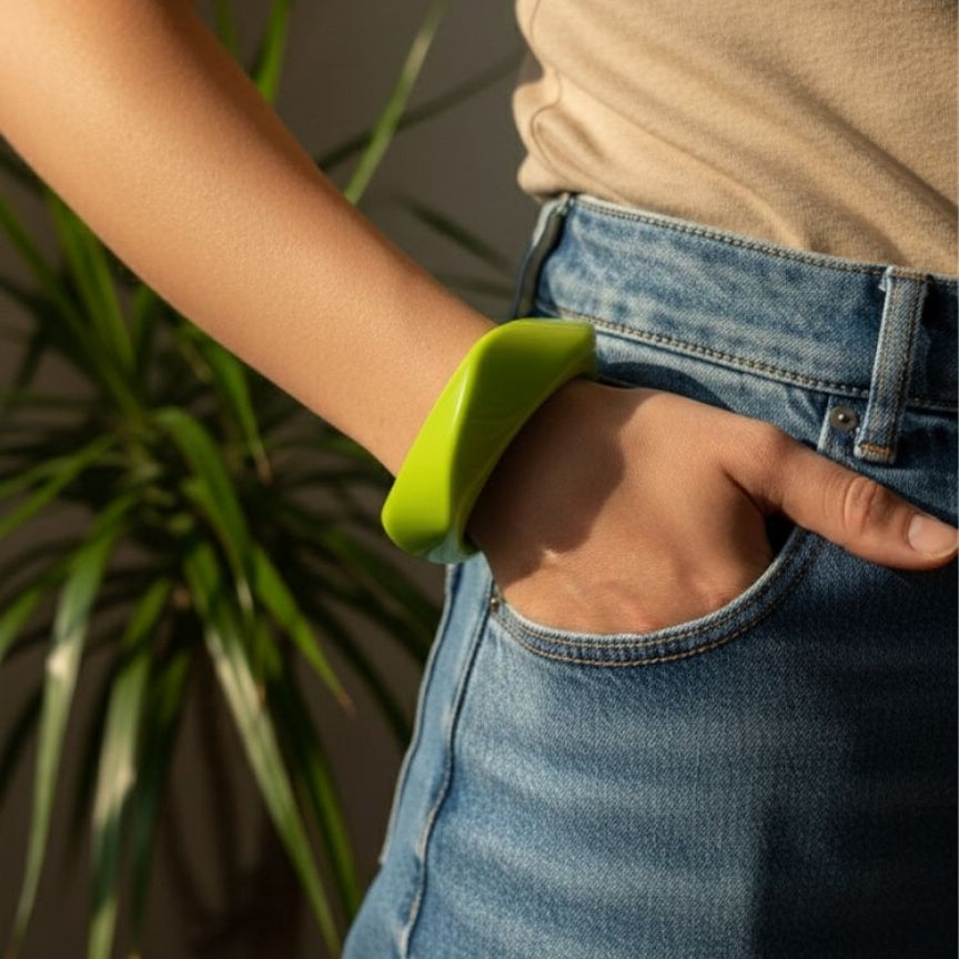 A bold pop of neon green with a sleek twist contour that adds a contemporary edge. Its glossy finish makes it perfect for statement styling or playful stacking with contrasting colours.