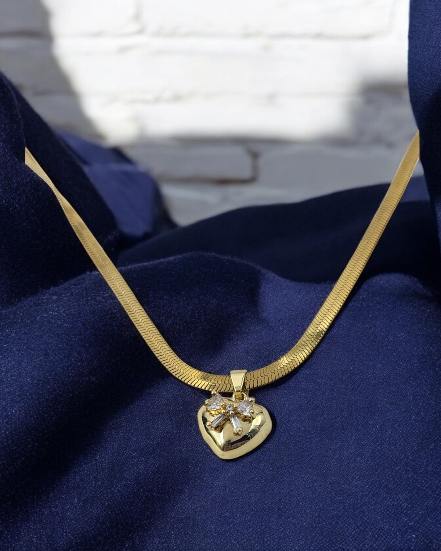 This necklace is a timeless expression of elegance and charm, featuring a polished gold heart pendant adorned with a delicate bowknot accent. Symbolizing love and grace, this exquisite piece adds a touch of sophistication to any look.